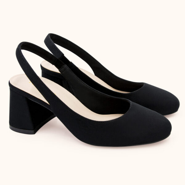 Chunky sandal 6cm bít mũi tròn dây quai hậu lụa đen sang trọng