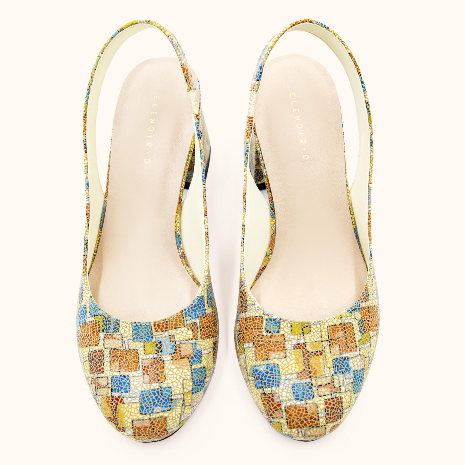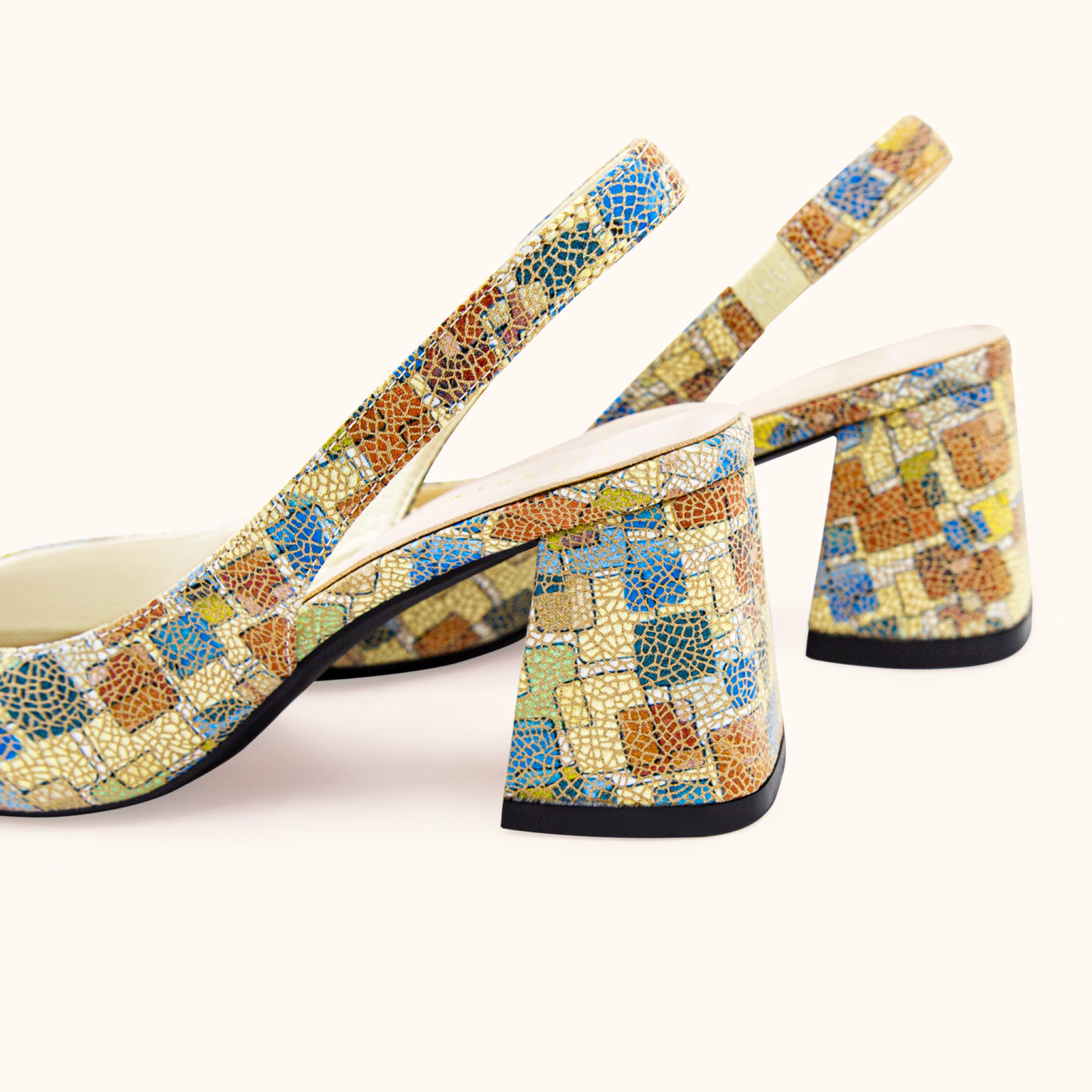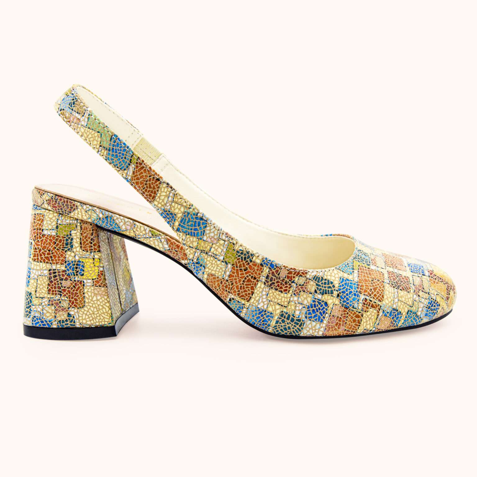 Chunky sandal 6cm bít mũi tròn dây quai hậu hiệu ứng hoa văn